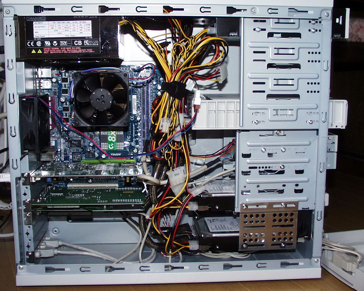 さてさてパソコンいじりぃ?の続きで実際の取り付けなんですけれども、当初CPUに取り付けようとしていたのは、前回のパソコンいじりぃ?の時に、背面のケースファンを回転数が可変のファンに入替えましたので、そのとき外したシステムファンです。このファンは常時1600rpm(15db以下)でまわるタイプです。となりますと、発熱量とは関係なく1600rpmなんですよね。私のへっぽこCPUは、それほど発熱量が多いわけでもありませんので、ファンの大型化に伴ってそれほど高速に回転する必要はありません。というわけで、先週背面につけた温度センサー付のファンをCPUへ取り付けてマザボのCPU用電源コネクタへつないで、1600rpmのファンを背面へ取り付けなおして、温度センサーによる可変機能のついた鎌力のファン用コネクタへ差し込みました。ま、きっとどのファンをとっても1100?1200rpmくらいで落ち着いていると思います。というわけで、給排気ファンとしては、前面に吸気1、背面に排気1、鎌力の(役立たずの)排気1の構成になりました。一応排気側の容量が大きいので、吸気ファン以外からの吸気口からも十分に外気が導入されると思いますので、ハードディスク以外の発熱部品にも十分冷却されることが期待できるんじゃないかと思います。それと、HDDブラケットは、本体のシャドウベイの金具に補強用のでっぱりがあるために、微妙に干渉してネジを締めたときに若干浮いたようになりますから、ここで何か共振をおこしてもいけませんので、気休めに防振ワッシャをかませてみました。というわけで、中は写真のようになりました。